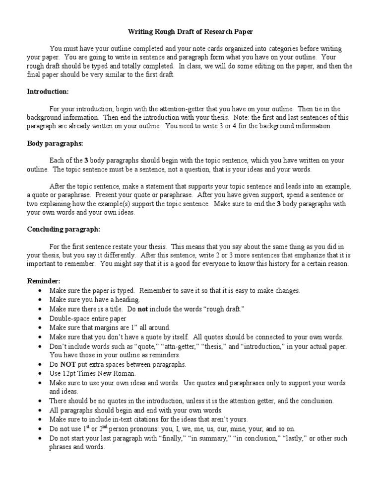 Business , information science and technology , education At last, you are ready to begin writing the rough draft of your research paper. *repeat above process for every notecard. When you start a rough draft, you are no longer just thinking about writing or planning on writing—you are doing it! Research paper rough draft category: It's a good idea to write an outline before starting your rough draft, to help organize your ideas and arguments. Apply guidelines for citing sources within the body of the paper and the bibliography. Take a look at this example with notes a student wrote on her rough draft. The sample rough draft on the right shows you an example of just how much more work a rough draft can need, even a really solid first draft. Even though a translation is possible, the newer english is more. Open and create a new word document (name it) 4. A rough draft is where your wildest ideas come out. Let's use an example on nuclear energy.